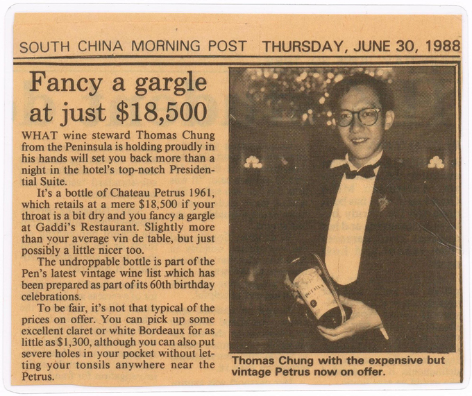 半岛酒店首席品酒师锺监明骄傲地拿着的瓶子,价值比该酒店一晚总统套房还的租金还贵。